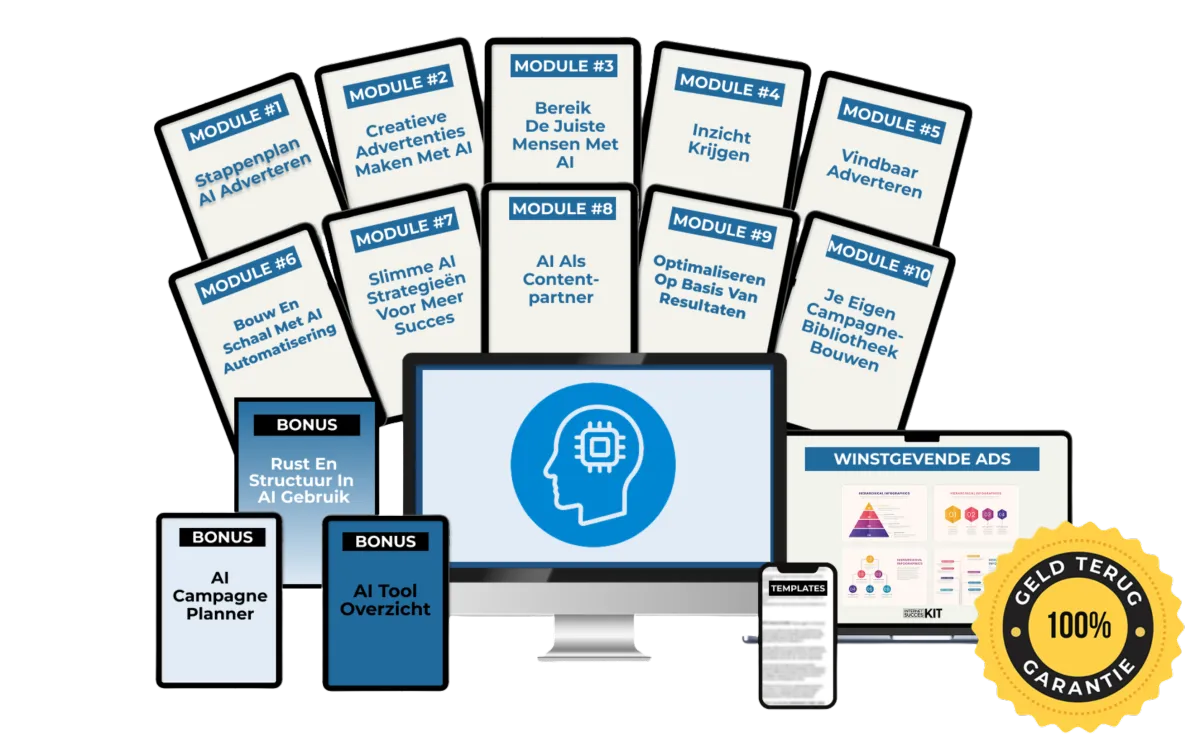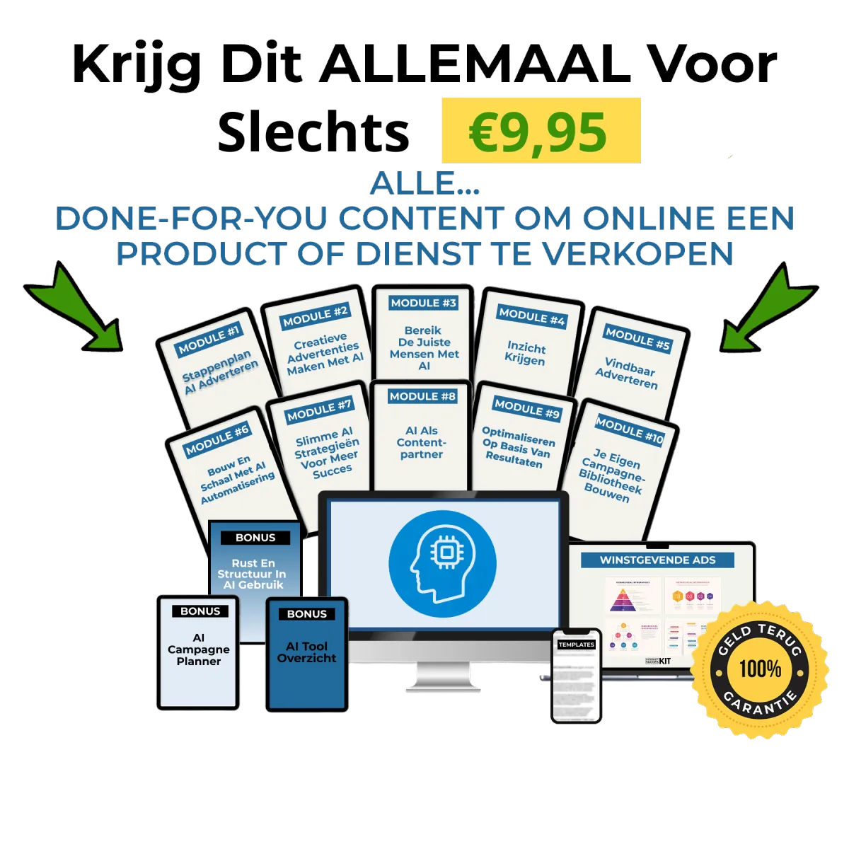 Je krijgt ALLES wat je nodig hebt om stap voor stap een krachtige campagne te bouwen: van advertentieteksten, visuals, AI-prompts, targetingstrategieën en biedinstellingen tot slimme optimalisatie, retargeting en testplannen.